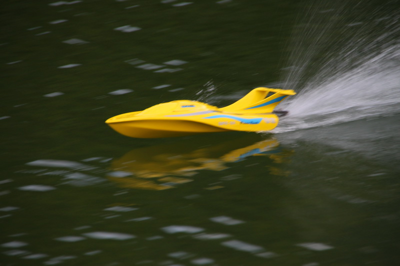 Diese Rennboot hat ein futuristisches Aussehen, sieht auf dem Wasser einfach nur gut aus und geht ab wie eine Rakete. Er ist aus der Verpackung bereits fast fertig Montiert und hat einen bruchless Motor mit Regler und ein Lenkservo. Nur noch Akku und Empfänger einbauen; Schiffschraube montieren und los geht's. Laut Hersteller ist das Modell über 40 km/h schnell, mal messen ob das stimmt.